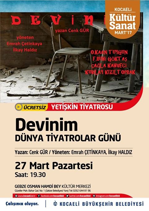 Bu akşam saat 19:30 Sevgili Doktor isimli tiyatro GKM'de sahne alacak. Bir diğer tiyatro gösterisi ise Osman Hamdibey'de sergilenecek. Devinim 'adlı eser ücretsiz olmakla birlikte 8 yaşından küçük çocukların girmesi de yasaktır.